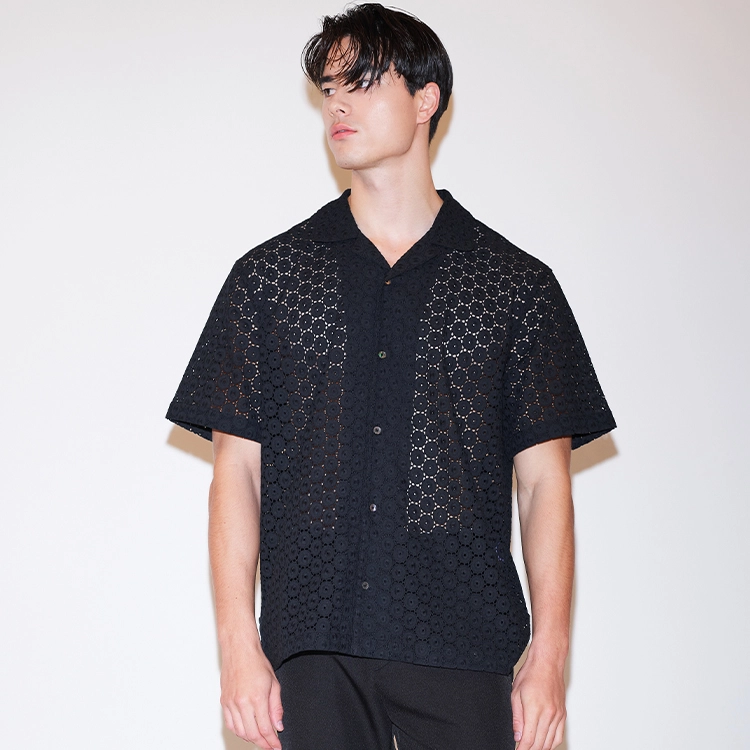 MULTI HOLE LACE OPEN COLLAR SHIRTS(BLACK)